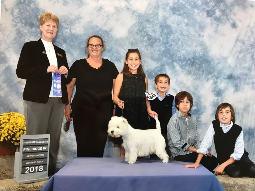 We have been breeding weimaraners for 24 years with many champions worldwide but it was really hard for our kids to show them as they are big dogs and every time we used to go to shows they were admiring the westies. Thanks to Lindy we started showing and breeding them and we have been so in love with the breed from the first day!!! we enjoy grooming them and it is very nice that both breeds grow and play together. Weims are not good with small breeds if not introduced early and the westies too. So, we find a bonus they are exposed to a different size, temperament, breed.